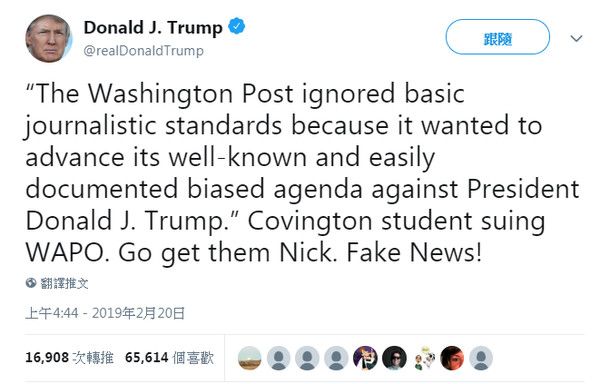 - 「華盛頓郵報無視基本新聞準則,因為他們想推廣那顯而易見的,針對川普的偏見」。科文頓學生對華郵提告。放手去告吧尼克(指提告學生)。假新聞!