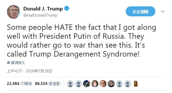 - 有些人就是不爽我跟蒲亭相處得很好。他們寧可看戰爭開打也不願接受這件事。這叫「川普精神錯亂症候群」!