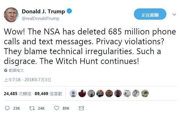 - 哇!國安局(NSA)已經刪除6.85億件電話紀錄與簡訊。侵犯隱私?他們卻聲稱是技術故障。居然這樣可恥,獵巫仍在繼續。