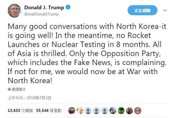 - 與北韓的良好對話很多都進展順利!同時,已經有8個月沒有飛彈試射或核試驗。全亞洲都激動了。只有包括假新聞在內的反對黨才會抱怨。如果不是我,我們現在正在和北韓打仗。