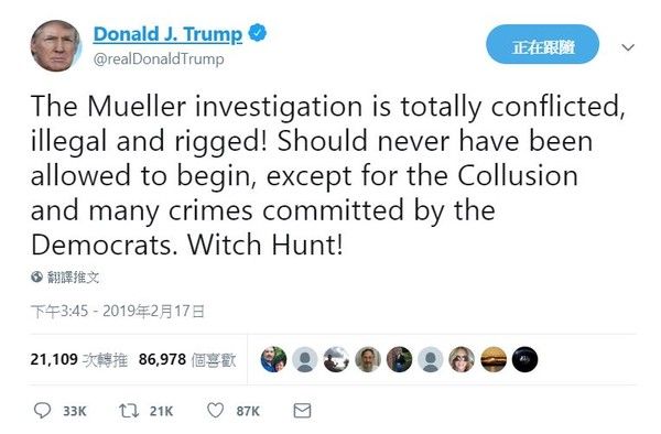 - 穆勒的調查完全是矛盾,非法操縱的!是一場不該被允許的調查。而應該調查的是民主黨的勾結,以及他們所犯下的種種罪行。獵巫行動!